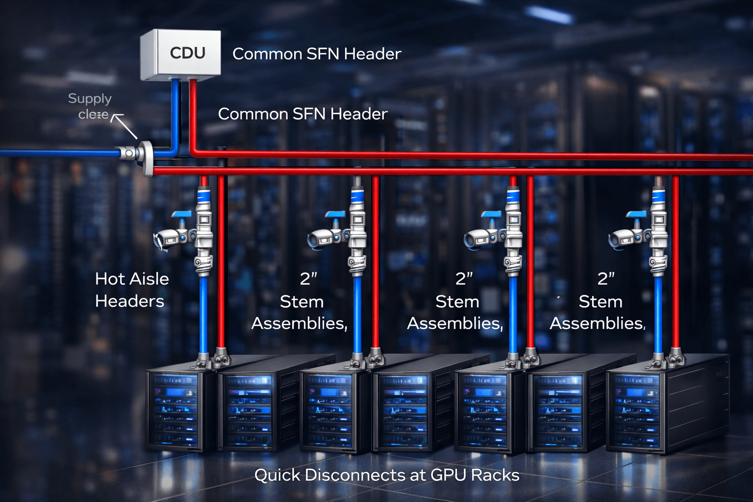 The SFN is the overhead stainless-steel coolant distribution backbone that transfers LC25 coolant from CDUs to liquid-cooled racks — safely, cleanly, and with modular expandability.
